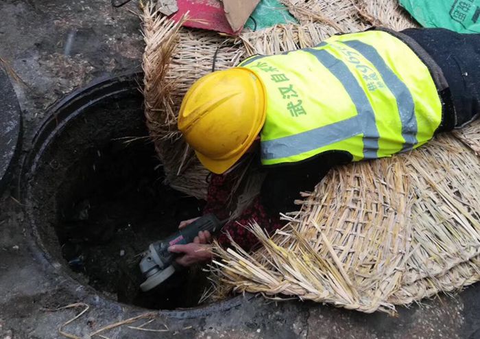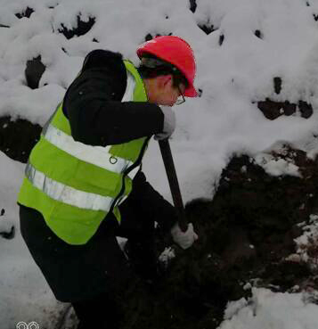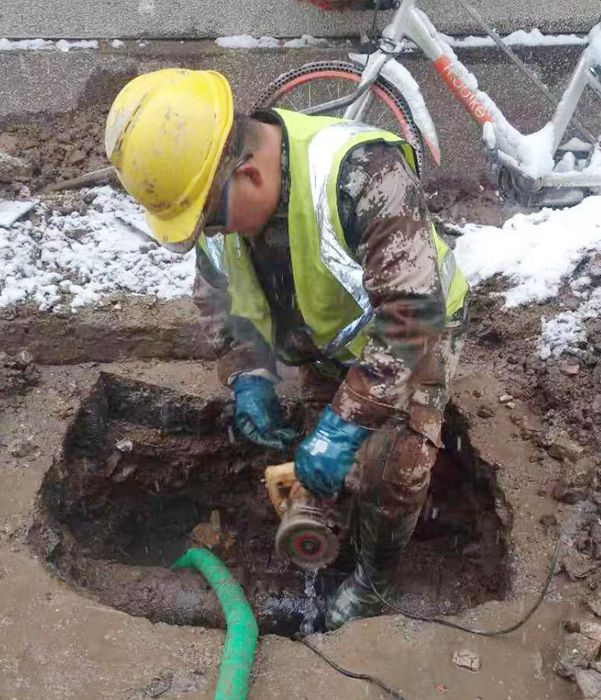 在積雪和泥濘中人工探挖漏水點