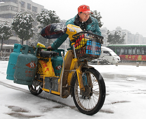 清晨6時(shí),武煤百江公司送氣工鮑學(xué)武匆忙告別麻城的親人,奔向武漢。1月30日晚上,回鄉(xiāng)的他看到天氣預(yù)報(bào)武漢將有小到中雪,即決定返漢。一到店,他就推著車(chē)送氣了,不歇?dú)獾厮土?9瓶,一直忙到下午2時(shí)才吃上飯。據(jù)統(tǒng)計(jì),31日,武煤百江公司送氣工除三人生病外,全部在崗送氣,公司共銷售液化氣1萬(wàn)多瓶,送氣上門(mén)率達(dá)95%以上。