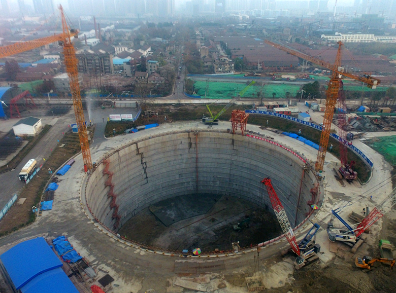 楊泗港長(zhǎng)江大橋是省市重點(diǎn)項(xiàng)目。大橋主跨1700米,是武漢市第十座長(zhǎng)江大橋、長(zhǎng)江上首座雙層公路橋、世界上跨度最大的雙層懸索橋。南北兩岸設(shè)置南北錨碇,錨碇為重力式錨碇,采用外徑98米,墻厚1.5米的圓形地連墻加環(huán)形鋼筋混凝土內(nèi)襯結(jié)構(gòu)。錨碇基礎(chǔ)由地連墻、帽梁、內(nèi)襯、底板及填芯混凝土組成。錨碇基礎(chǔ)頂高程為24米(帽梁頂標(biāo)高),基礎(chǔ)底面高程為-15米,最大開挖深度36米,開挖總量在26.2萬方左右。內(nèi)襯為沿豎向分段變厚的鋼筋混凝土環(huán)形結(jié)構(gòu),共12層,每層分為10個(gè)單元采用逆作法施工,即開挖一層土體施工一層內(nèi)襯,內(nèi)襯混凝土總方量在2.8萬方。