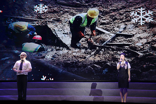 “我如果是雪,怎會讓冰棱打造特殊的戰(zhàn)場,讓城市的血管被殘暴的凍傷?但我不是,我只是你的孩子,只能聽你說起,在銀裝素裹里身披雪花的景象,美得像是純潔的詩行…”,隨著水務(wù)集團朗讀者的娓娓道來,現(xiàn)場觀眾的思緒被拉回到2018年年初的那場大風(fēng)雪中,天寒地凍,居民用水告急,水務(wù)集團的普通黨員們,夜以繼日,辛勤不輟,不分分內(nèi)分外,全力以赴搶修保供。許多職工無暇顧及家中年幼的孩子,長時間奔波在防凍保供的第一線,成了孩子眼中“不合格”的家長。水務(wù)集團的原創(chuàng)詩作《我如果是…》,以孩子的視角,再現(xiàn)了冰天雪地里水務(wù)集團廣大黨員干部職工以清新作風(fēng)保供擔(dān)當,舍小家為大家,傳遞暖心“為民情懷”的故事。一幕幕場景、一句句訴說,直擊人心,許多人感動的熱淚盈眶。?口區(qū)紀委領(lǐng)導(dǎo)稱贊道:“水務(wù)集團創(chuàng)作的節(jié)目讓我們感動落淚,水務(wù)集團作出的貢獻讓我們深深感謝!”