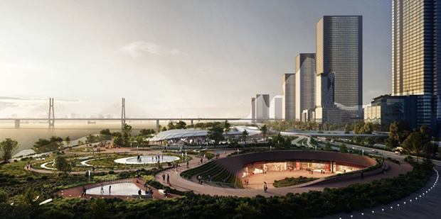 月亮灣城市陽(yáng)臺(tái)項(xiàng)目,位于武漢市長(zhǎng)江二橋以南、武昌濱江商務(wù)區(qū)核心節(jié)點(diǎn)區(qū)域,規(guī)劃用地約194畝,涉長(zhǎng)江岸線(xiàn)約1.1公里。該項(xiàng)目是全市規(guī)劃建設(shè)的九大陽(yáng)臺(tái)之一,也是唯一擁有天然地域優(yōu)勢(shì)的城市開(kāi)放空間。項(xiàng)目由全球著名設(shè)計(jì)公司英國(guó)扎哈?哈迪德建筑師事務(wù)所設(shè)計(jì),分一期和二期建設(shè)。一期為景觀(guān)綠化及陽(yáng)臺(tái)工程,2019年1月開(kāi)工建設(shè)。二期整體策劃定位為武漢長(zhǎng)江生態(tài)文化長(zhǎng)廊綜合展示中心。