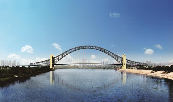 江漢七橋?yàn)殇撹旃皹颍缬驖h陽、?口兩個(gè)行政區(qū),是武漢市第七座跨漢江通道。大橋距下游知音橋1.2千米,距上游古田橋2.6千米,全長(zhǎng)約2.7公里,主橋長(zhǎng)672米。主跨長(zhǎng)408米,為國(guó)內(nèi)同類橋梁第二。大橋預(yù)留雙向8車道空間,橋面寬達(dá)52.5米,是漢江上最寬的大橋。大橋建成后,將有效減輕二環(huán)線過漢江交通壓力,將武漢?口、江漢、東西湖、漢陽和沌口五個(gè)城區(qū)工業(yè)園區(qū)域進(jìn)一步有機(jī)連接起來,促進(jìn)漢口漢陽一體化發(fā)展。